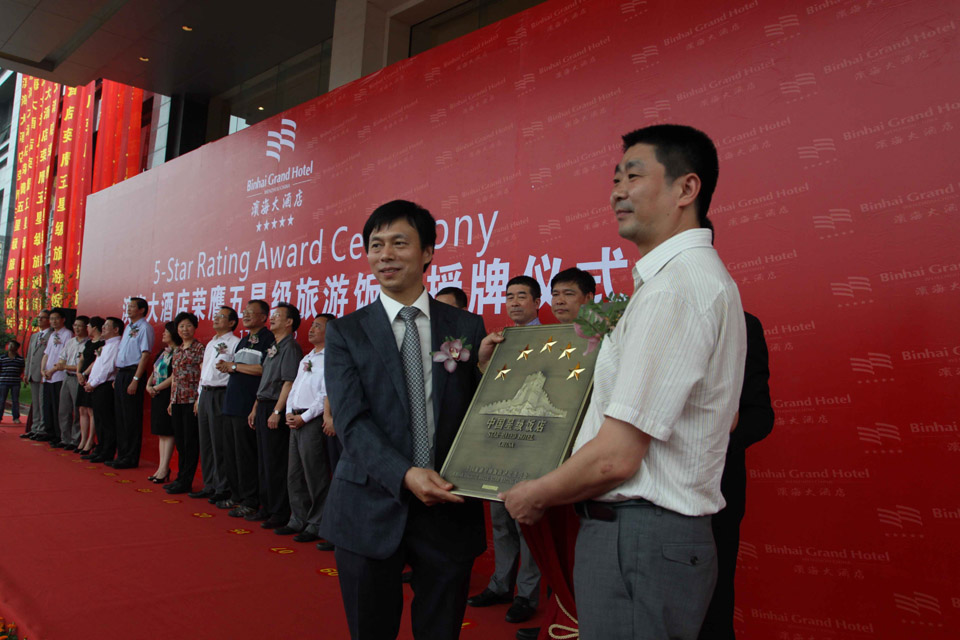 酒店于2010年上半年开始申请五星级酒店。经过一年多的创建,经省、市饭店星级评定机构推荐,全国星评委先后三次严格现场检查和评审,滨海大酒店凭借优越的区位优势,完善的硬件设施,优质的服务,顺利通过了国家五星级饭店的验收审核,于2012年6月12日正式获批五星级旅游饭店,滨海大酒店出由此成为温州市龙湾区首家五星级旅游饭店。此次滨海大酒店荣膺“五星”不仅填补了龙湾区没有五星级酒店的空白,同时也增强了对外接待的整体实力,大大提升了龙湾区的整体接待服务水平。授牌仪式上,滨海大酒店冯定献董事长代表酒店向温州市公共外交协会捐款10万元;向温州市慈善总会侨爱分会捐款50万元,善款将由龙湾区慈善总会用于龙湾区捐资助学专项事业。冯定献董事长表示,滨海大酒店将以此次荣膺五星级酒店为契机,继续完善与提高酒店管理水平和服务质量,自主创建酒店优质服务品牌,为当地经济发展继续做出积极努力。