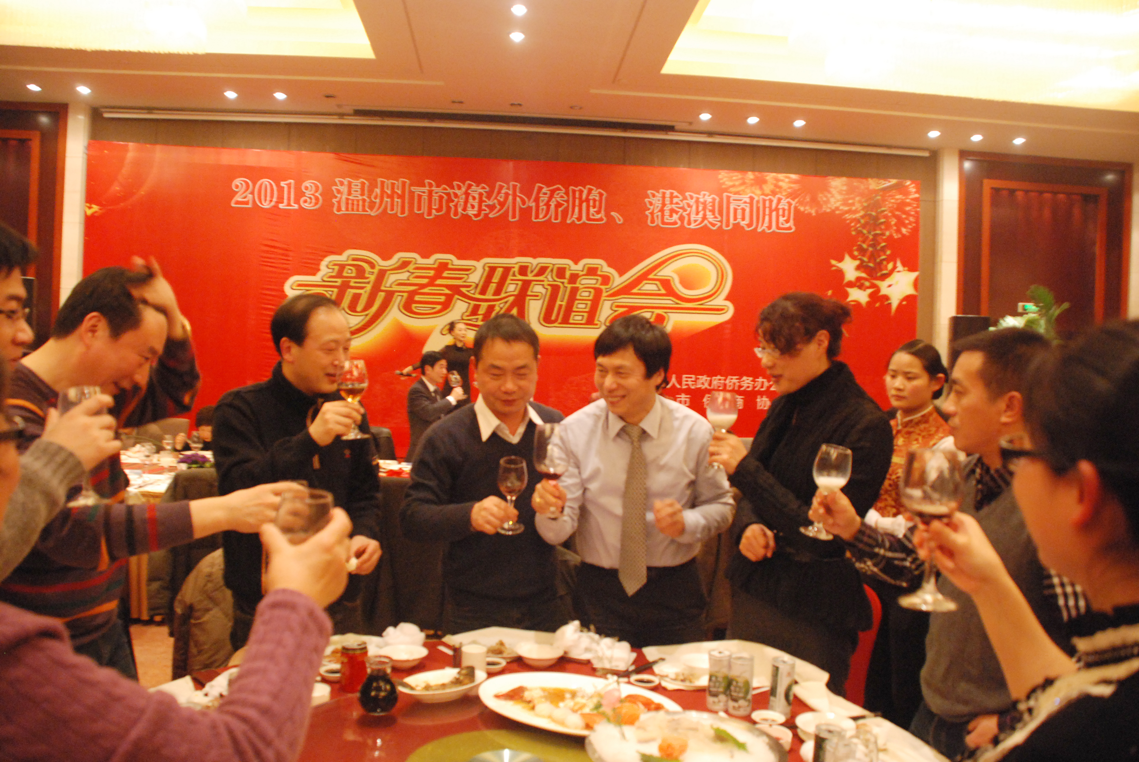 晚上, 盛大“2013年温州海外侨胞、港澳同胞新春联谊会”在滨海大酒店滨海厅举行, 作为温州海外侨胞之一即是滨海大酒店董事长冯定献先生, 一直以来从各个层面积极关注和参与家乡的投资建设,此次联谊会冯定献先生携同酒店全体员工热情接待各位海外侨胞、港澳同胞等贵宾的光临,积极宣扬温州的投资环境和优惠政策。